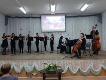 - камерный оркестр школы (руководитель Любимова Л.А., концертмейстеры Попов С.С., Хисмятова Ф.Ф.) – Евгений Дога, вальс из кинофильма «Мой ласковый и нежный зверь».