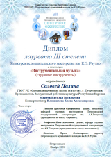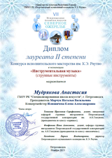 29 ноября оглашены итоги исполнительских конкурсов VII Международной Ассамблеи искусств "Северное ожерелье" (Петрозаводск, ПМК имени К.Э. Раутио). Ученицы преподавателя, заслуженного работника культуры РК Марчук Н.В. - среди победителей этого авторитетного состязания музыкантов. Настя Мудрякова (2 кл.) награждена дипломом лауреата II степени., Полина Соловей (4 кл.) - дипломом лауреата III степени. Наши поздравления девочкам, их педагогу и концертмейстеру - Илюшичевой Е.А.!