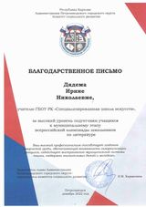 Поздравляем призёра муниципального этапа всероссийской олимпиады школьников по литературе обучающего 11 класса Бондаренко Никиту и учителя русского языка и литературы Дядёму Ирину Николаевну за высокий уровень подготовки обучающихся к олимпиаде по литературе. Высокий профессионализм Ирины Николаевны способствует созданию творческой среды, обеспечивающей возможности самореализации учащихся, содействует выстраиванию муниципальной системы поиска, поддержки талантливых детей и молодёжи.