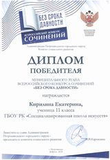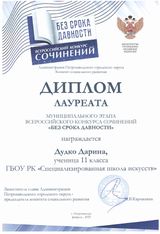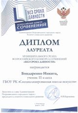 Обучающиеся 11А класса Кирилина Екатерина, Бондаренко Никита, Дудко Дарина - награждены дипломами лауреатов Муниципального этапа Всероссийского конкурса сочинений «Без срока давности». Поздравляем учителя русского языка и литературы Дядёму Ирину Николаевну с победой обучающихся.