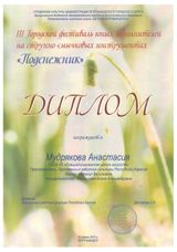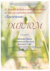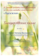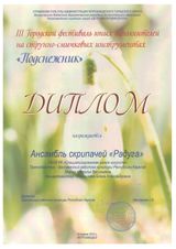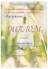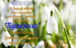 16 апреля состоялся III Городской фестиваль юных исполнителей на струнно-смычковых инструментах «Подснежник». Организатор – Петрозаводская Детская хоровая школа. Достойно представили нашу школу на этой престижной сценической площадке юные скрипачи класса заслуженного работника культуры РК Н. В. Марчук (концертмейстер – Е.А. Илюшичева): Мудрякова А. (3 кл.), Соловей П. (6а кл.), Садыкова М. (8б); Трио (Садыкова М., Шишмолина В., Войтович Г.); Ансамбль скрипачей «Радуга» (Садыкова М., Шишмолина В., Войтович Г., Соловей П., Мудрякова А.). Все участники фестиваля награждены дипломами, а педагог и концертмейстер – Благодарностями директора ДХШ.
