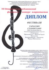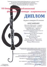 Три юных кларнетиста «Специализированной школы искусств» выступили в фестивальной номинации: Мадина Агеева (4 кл.), Станислав Тарасов (5б кл.) и впервые вышедший на сцену с кларнетом Пётр Тимофеев (8а кл.). Ребята награждены «дипломами фестиваля». В конкурсных прослушиваниях приняли участие Адриан Климов (3 кл. – «дипломант конкурса») и в ансамблевой номинации - Василиса Васильева (9а, «лауреат II степени»). Успех Василисы разделили её партнёры по ансамблю - Александр Балабаев (флейта, 8а кл.) и Глеб Войтович (скрипка, 9а кл.). Кларнетистов подготовил к выступлению педагог С. В. Веселов и концертмейстер Ф. Ф. Хисмятова. В подготовке дуэтов участвовали педагоги Н.В. Марчук и А.В. Ротобельская. Все взрослые наставники награждены благодарственными письмами. Поздравляем!