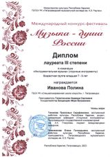 21-24 декабря в Петрозаводском музыкальном колледже имени К. Раутио проходил Международный конкурс-фестиваль «Музыка – Душа России». Полина Иванова (скрипка, 3 кл.), впервые в своей небольшой музыкальной жизни награждена дипломом лауреата III степени! Педагог Полины - Галактионова Надежда Сергеевна, концертмейстер - Багдасарян Мери Ваграмовна. Поздравляем!