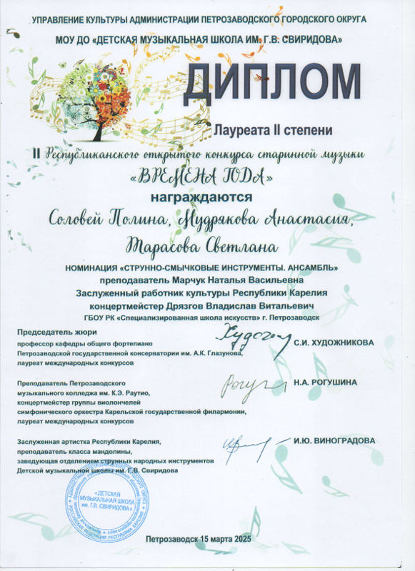 15 марта в Концертном зале Петрозаводского музыкального колледжа имени К. Раутио проходил II Республиканский открытый конкурс старинной музыки «Времена года» среди учащихся ДМШ и ДШИ. Дипломами Лауреатов II степени награждены конкурсанты из нашей школы: