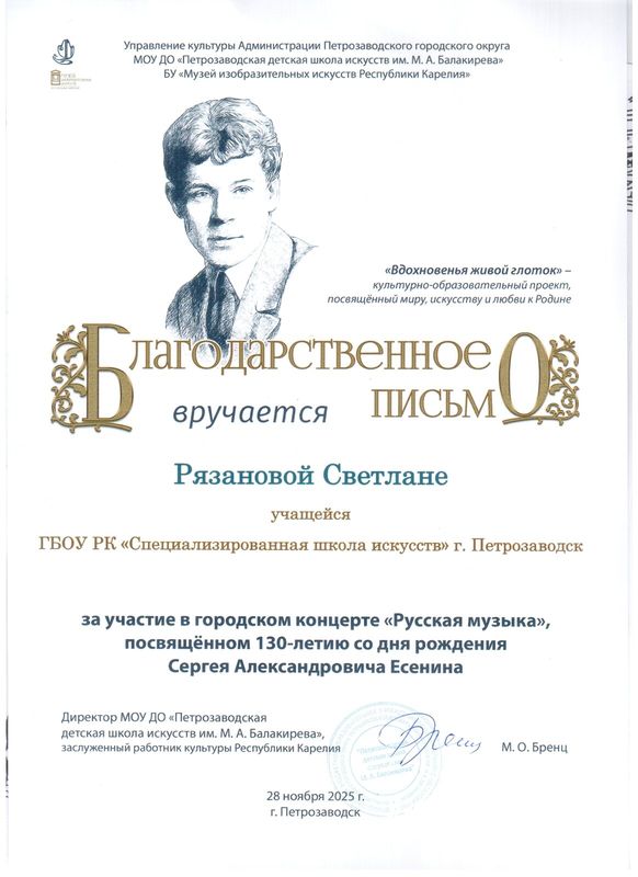 28 ноября в Музее изобразительных искусств Республики Карелия состоялся Городской концерт «Русская музыка», посвященный 130-летию со дня рождения С.А. Есенина, организованный Детской школой искусств имени М.А. Балакирева.С произведением М.П. Мусоргского в концерте успешно выступила Светлана Рязанова (виолончель) ученица 3 класса, педагог - И.Р. Якупова, концертмейстер – В.В. Бердино. Поздравляем!
