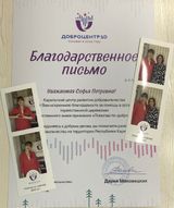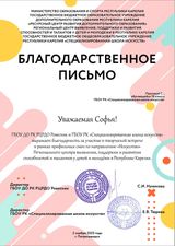 В декабре, подводя итоги триместра, мы благодарим наших учеников за большие достижения не только в творчестве, но и в деятельности во благо людей. Софья Павлова активная участница многочисленных церемоний, концертов, образовательных мероприятий дарит свое искусство и рассказывает о своем творческом пути ровесникам, педагогам, работающим с талнтливыми детьми, отзывчива и всегда готова к выступлению перед публикой. Благодарственное письмо Софье Павловой за участие в творческой встрече с участниками профильной смены СИРИУС 10 по "искусству" пришло из Регионального Центра Одаренных Детей.