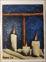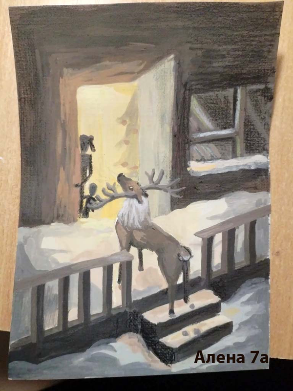 Юные художники Соломатова Анастасия (9а), семиклассники Георгий Дьячков, Данила Король, Роман Абрамов, Софья Алимпиева, Алёна Рекина под руководством замечательного педагога Владимира Станиславовича Левицкого дарят учителям новогоднее настроение, созданное в своих работах.