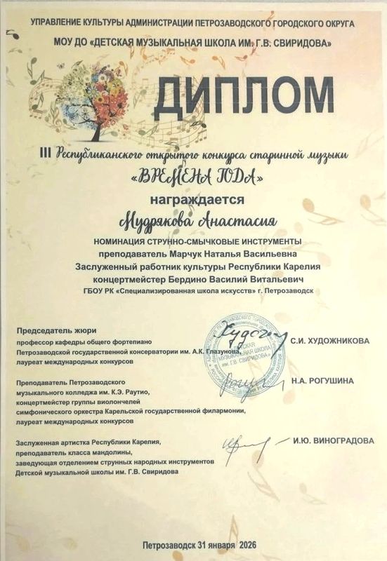 Петрозаводского городского округа «Детская музыкальная школа имени Г.В. Свиридова». Дипломантом конкурса стала Анастасия Мудрякова, 6а класс. Настя обучается в классе скрипки у педагога, заслуженного работника культуры РК Марчук Н.В., концертмейстер - Бердино В.В. Поздравляем!