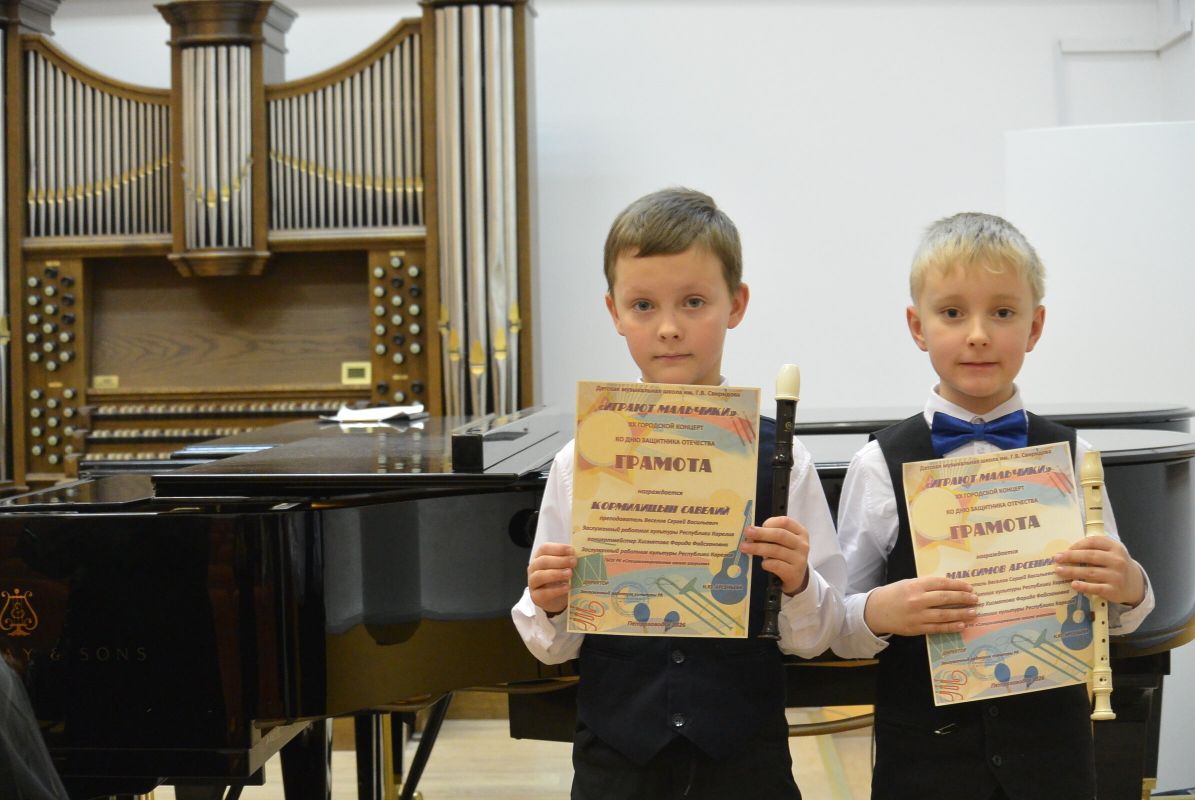 Поздравляем Арсения Максимова (1а кл.) и Савелия Кормилицына (2а кл.) с успешным выступлением на ХХ Городском концерте «Играют мальчики», посвящённом Дню защитника Отечества. Организатором концерта является ДМШ имени Г. Свиридова, а проходил он в Петрозаводской государственной консерватории имени А.К. Глазунова, в Малом концертном зале 21 февраля. Ребята учатся в классе заслуженных работников культуры Республики Карелия - педагога С.В. Веселова и концертмейстера Ф.Ф. Хисмятовой. Молодцы!